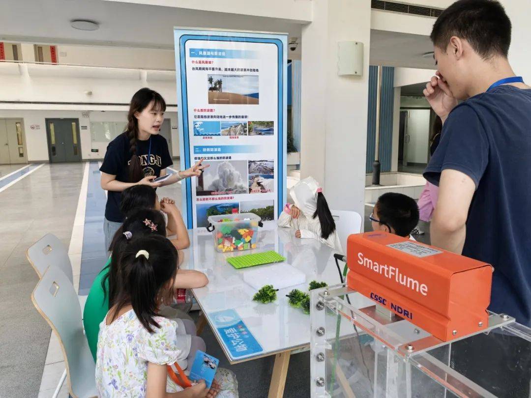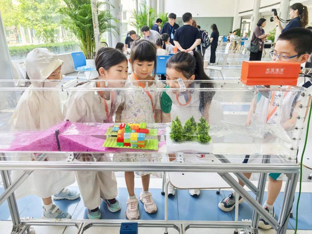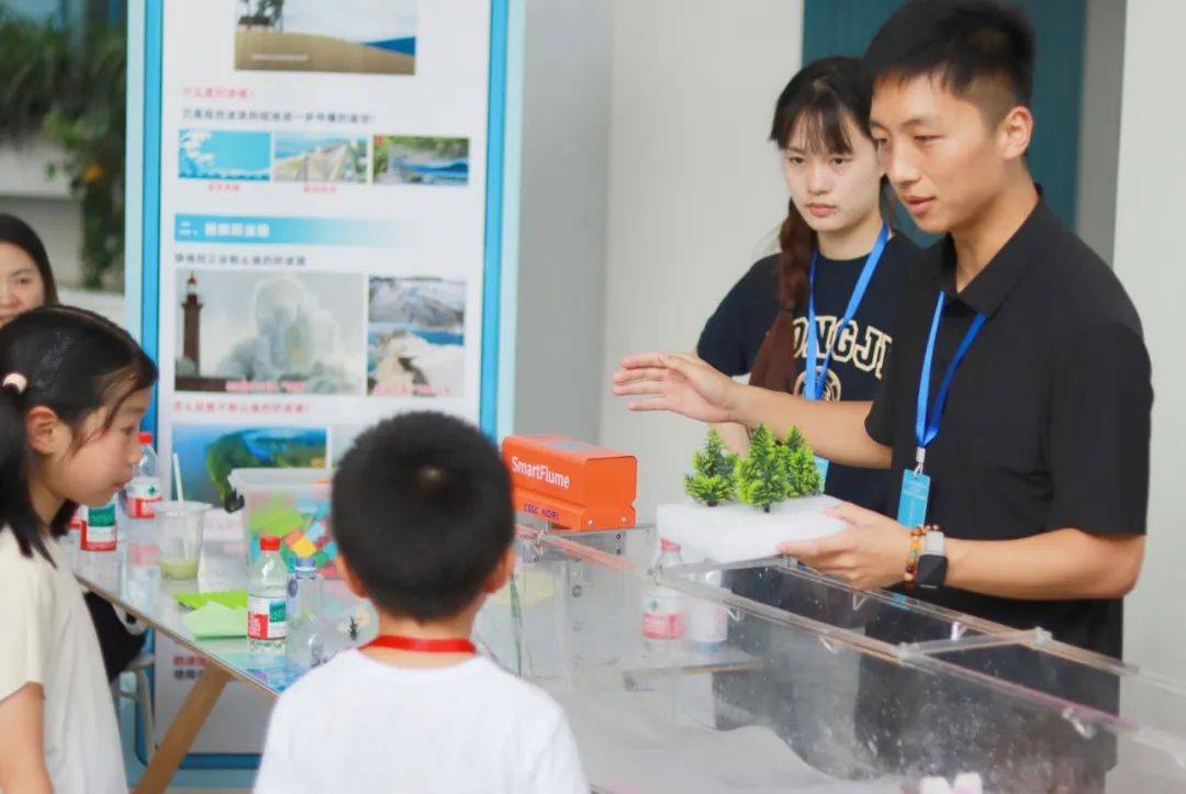 在互动实验环节,小朋友们化身“小小工程师”,亲自动手用积木模拟搭建“防波堤”,并自由摆放植物模型模拟“消浪植物”,共同构建了“红树林+防波堤”的智慧防灾组合体系。随后,借助“教学级波浪水槽”,小朋友们亲眼目睹了模拟波浪作用下,由植物群落和消浪构筑物组成的“组合消浪结构”如何有效地消减波浪能量,直观理解了工程手段在抵御自然灾害中的强大作用。